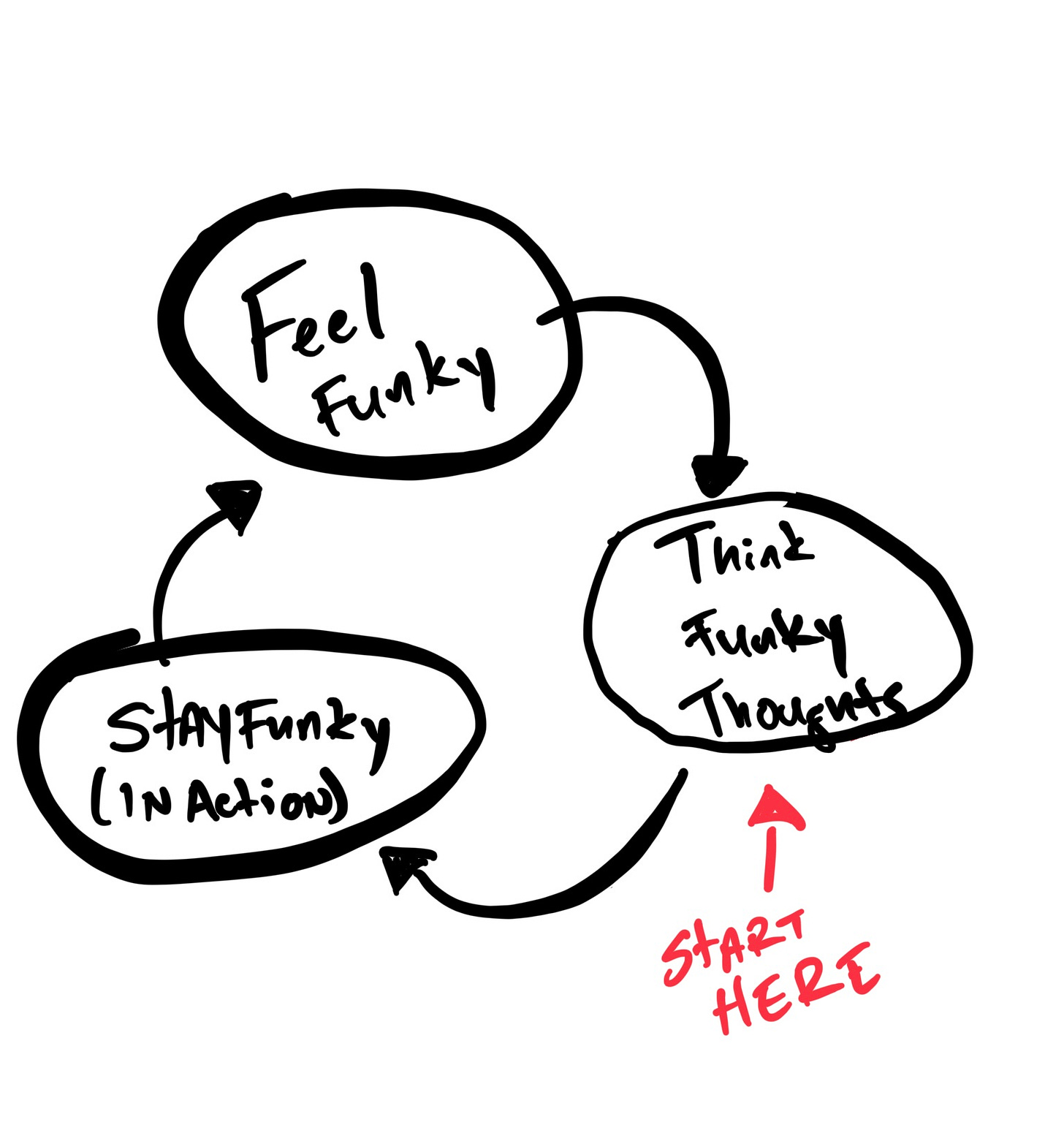 I’ll share with you my deeply unscientific model of funkiness. First, you feel funky. Then, you think funky thoughts. Then you do funky stuff, or maybe, do not a whole lot and let the funk linger and grow. The cycle repeats: feel bad, think bad, don’t do much about it.